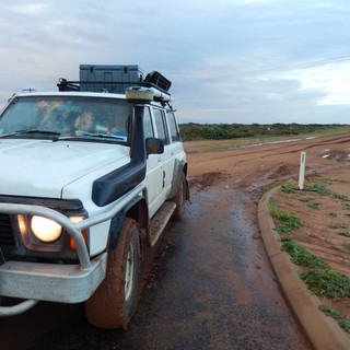 Es hatte ueber nacht geregnet. Das hatte ich vernommen, aber mir im halbschlaf nichts dabei gedacht. Haette ich mal frueher geschaltet. Naja, am morgen hatten wir uns soweit fertig gemacht, motor gestartet, losgefahren, nach rechts gelenkt und nach links in den graben gerutscht. Uiuiui. Der rote sand und schotter hatte sich durch den regen in ein reines schlammfeld verwandelt. Und dieser rote sand kann in nassem zustand verdammt rutschig sein. Ich kletterte raus, hangelte mich am auto entlang, um nicht im schlamm zu versinken und machte die raeder startklar fuer den gelaendegang. wir waren bereit. Gaaaanz langsam ging es stueck fuer stueck durch den schlamm. Ich versuchte, weitesgehend in der mitte zu bleiben, da die strasse zu den seiten hin abfallend war. Aber immerwieder rutschten wir runter, man konnte nichts dagegen tun. Die 7km zogen sich lang. Nach ca einer halben stunde waren wir endlich wieder auf der geteerten strasse. Das auto war dreckig, die strasse ruiniert durch meine tiefen spuren, die im trockenen zustand nicht mehr zu befahren sind. Als wir da so standen, kam ein weisses auto. Zwei arbeiter sahen uns und unsere spur verbluefft an, dann stellten sie ein schild hinter uns, auf dem stand “strasse gesperrt”. Super! Das haette uns am abend mal jemand sagen sollen!