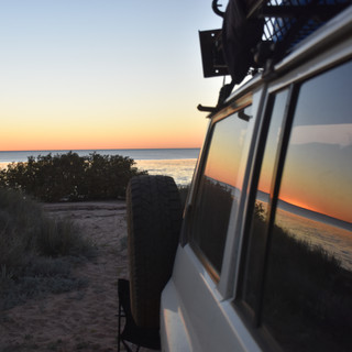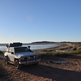 Wir befanden uns auf einer halbinsel, sodass wir wieder die ueber 400km zurueck fahren mussten. Zurueck auf der kuestenstrasse, ging es wieder weiter nach oben. Wir erreichten carnarvon. Es wurde endlich warm. Schon ein bisschen tropisch warm war dieses staedtchen. Wir hatten gutes abendessen am meer, ok eigentlich war es nicht so lecker, da die tintenfischstuecke nicht so ganz durch waren. Wir schlenderten noch ein wenig umher, bevor wir an eine kleine bucht zurueckkehrten, die wir auf dem hinweg schon ausspioniert hatten. Eine strasse ins nirgendwo, 7km schotterstrasse gerade aus. Es war ruhig, niemand fuhr dort hin am abend. Wir hatten eine ruhige nacht und am naechsten morgen die naechste ueberraschung.